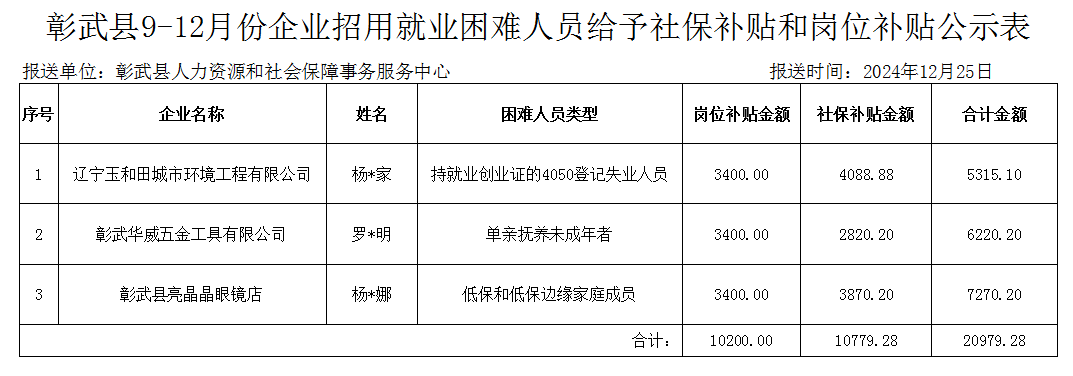《辽宁省就业补助金管理办法》(辽财社规[2024]8号)和《阜新市城镇就业困难人员就业援助办法(试行)》(阜人社发[2016]219号)文件的要求,经过单位申请、资料审核,拟同意以下3家单位发放2024年9-12月份就业困难人员社保补贴和岗位补贴,现予以公示,详见附表。
